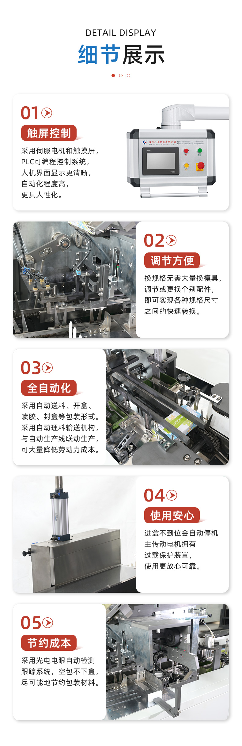 產(chǎn)品概述:本設(shè)備用于加寬面巾紙、方巾紙、手帕紙、棉柔巾等自動(dòng)入盒封盒包裝,采用伺服傳動(dòng)及PLC控制系統(tǒng).存儲(chǔ)紙盒平臺(tái),自動(dòng)取盒至輸送機(jī)構(gòu)并開盒成型然后送至撐盒機(jī)構(gòu);然后模具將產(chǎn)品推入紙盒,紙盒行進(jìn)過程中自動(dòng)噴膠機(jī)封盒并送出包裝機(jī).